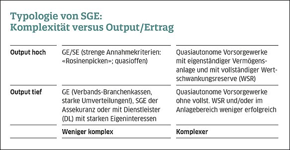 Was auf den ersten Blick wie ein komplexes Sammelsurium aussieht, ist bei näherer Betrachtung durchaus überschaubar, siehe Grafik. Die horizontale Achse teilt die SGE in mehr oder weniger komplexe auf: Einfach sind jene SGE, wo die angeschlossenen Firmen bzw. deren Vorsorgekommissionen nicht selbst über Vermögensanlage und Verzinsung entscheiden können. Komplex sind sie, wenn dies der Fall ist. Die vertikale Achse zeigt den Output: die Höhe der Leistungen, also die Verzinsung und die Höhe der Umwandlungssätze (UWS). Interessant ist die Frage, ob eine höhere Komplexität auch zu mehr Output führt: Swisscanto kommt aufgrund eigener Analyse zum Schluss, dass firmeneigene PK mehr Zinsen zahlen, andererseits SGE höhere Umwandlungssätze haben. So einfach ist es wohl nicht: Es gibt tatsächlich eine Gruppe von «einfachen» SGE, die überdurchschnittlich gut verzinst, dagegen gibt es auch bei den komplexen SGE Anschlüsse, wo dies der Fall ist. Andererseits gibt es auch viele GE (vor allem Branchenkassen), die schlecht verzinsen, gerade weil hier eine auferlegte Solidarität grossgeschrieben und der BVG-Umwandlungssatz massiv quersubventioniert wird.